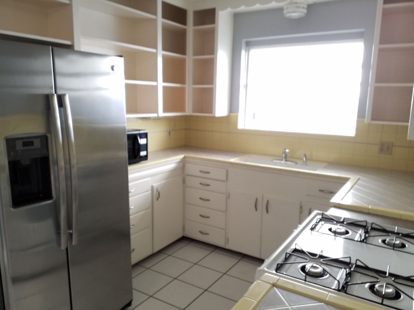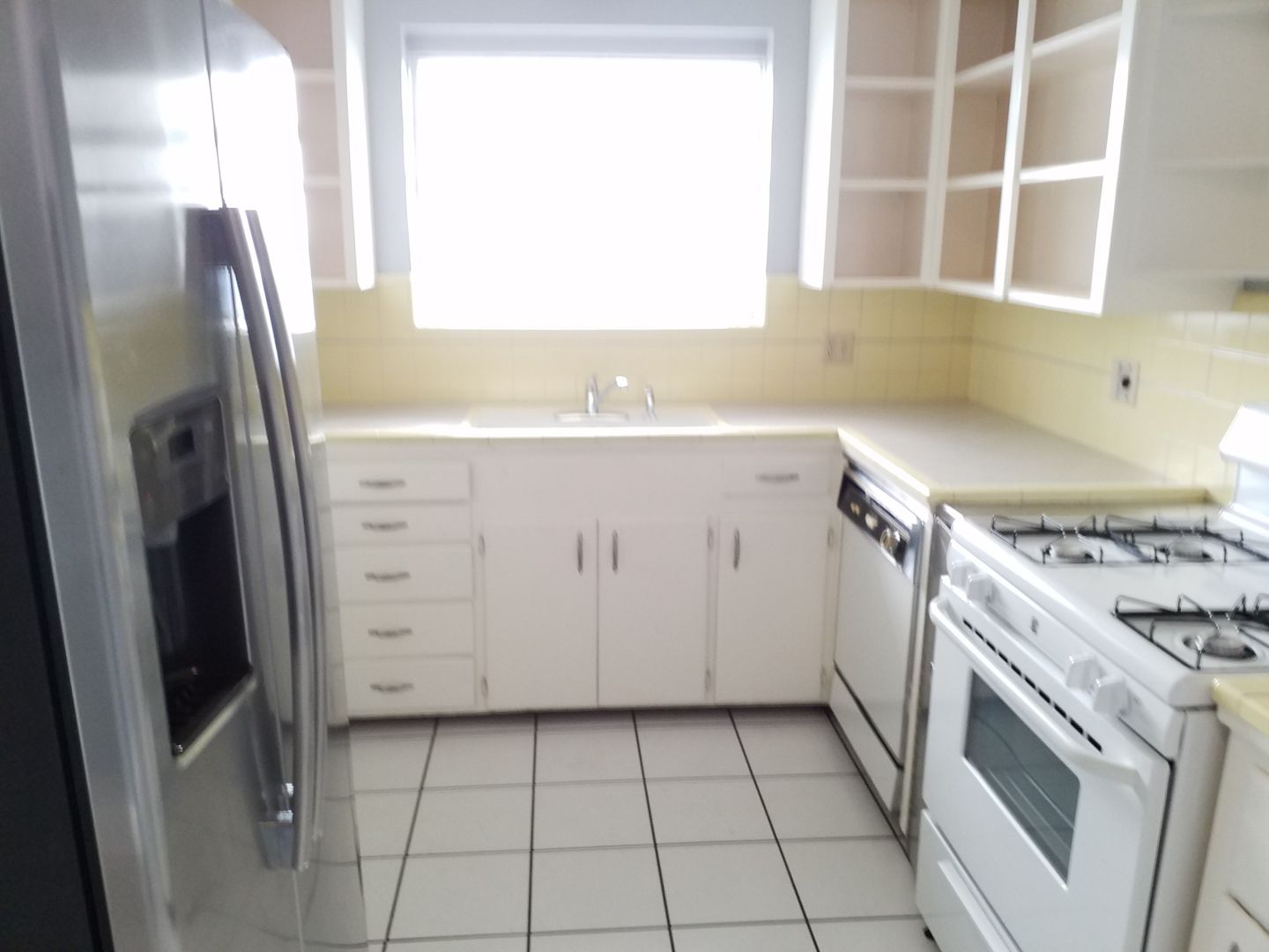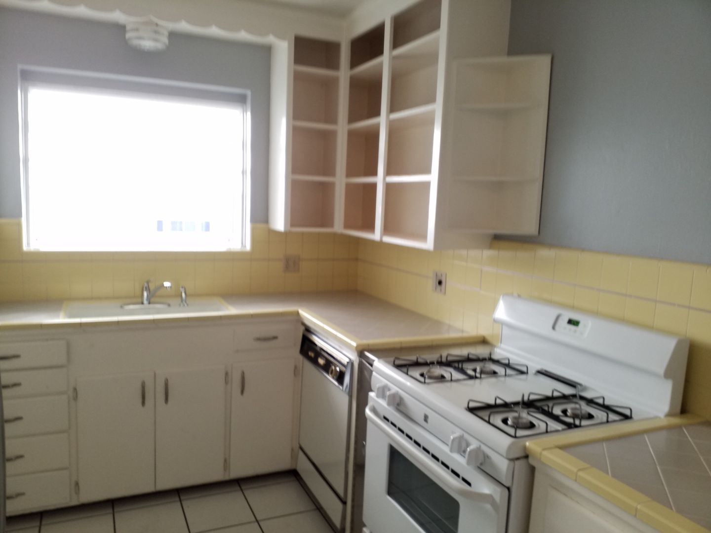 **The kitchen again is decorated in 30's tile and comes with a fridge with no warranties, a dishwasher, gas stove and plenty of cabinets that are open in view