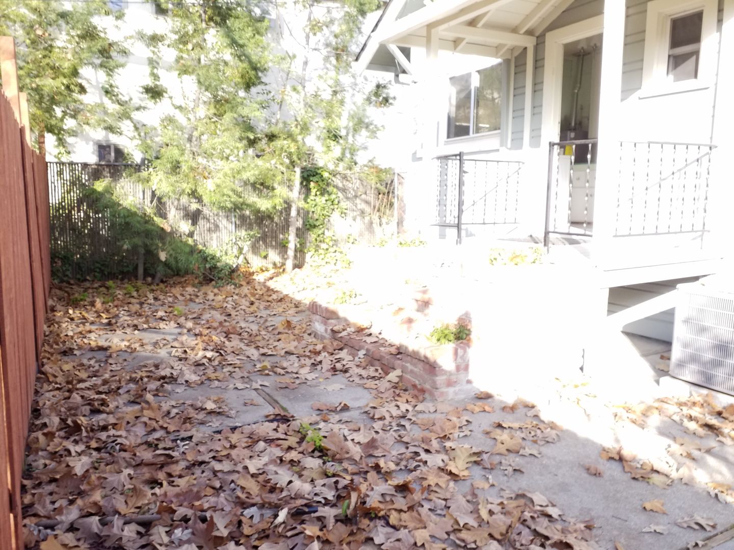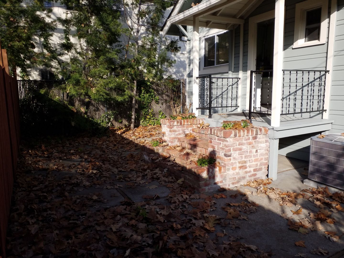 **The backyard is small low maintenance for ease of care with a small patio and plants