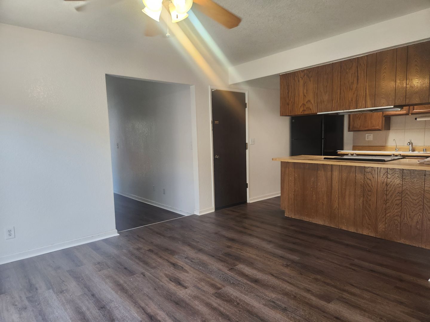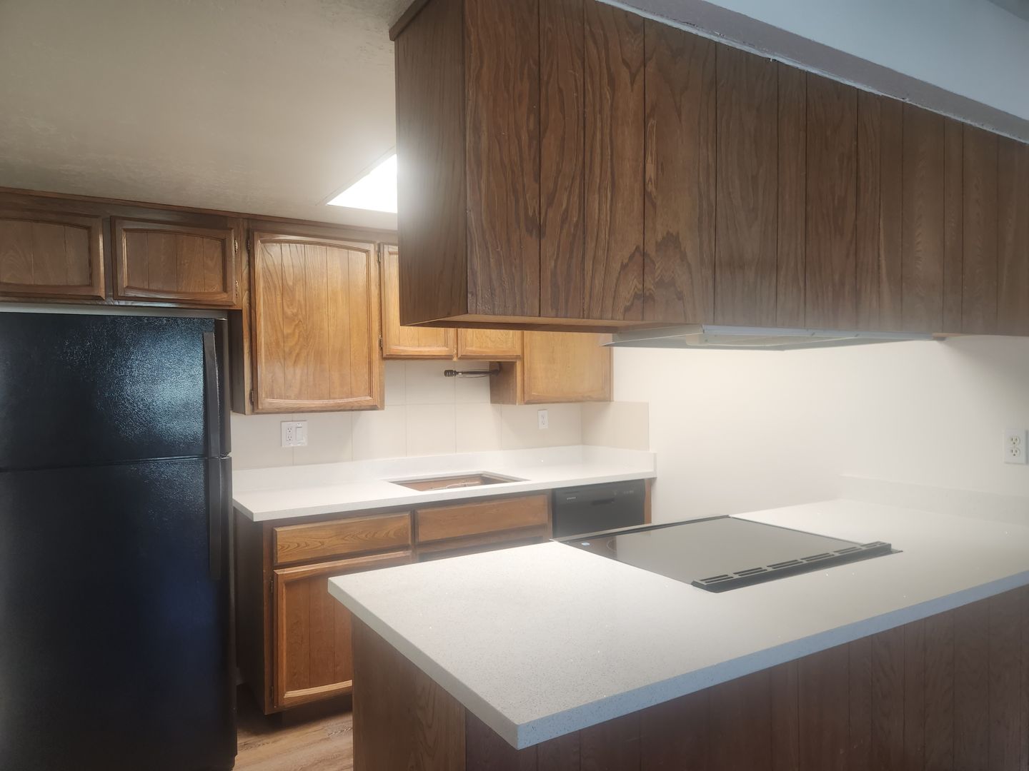 The kitchen has LVP flooring, new lighting, new electric stove, plenty of cabinets, new quartz counters, Fridge and opens up to the dining room and living room
