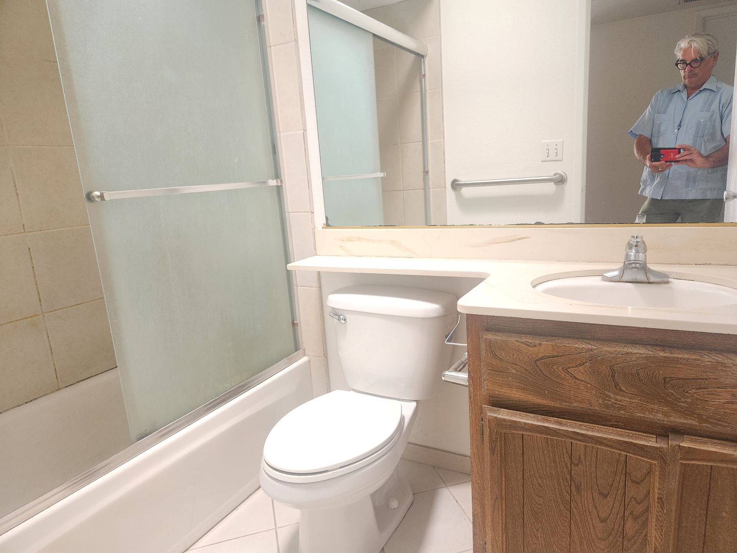 The bathroom has tub w shower over and tile floor and new counter top