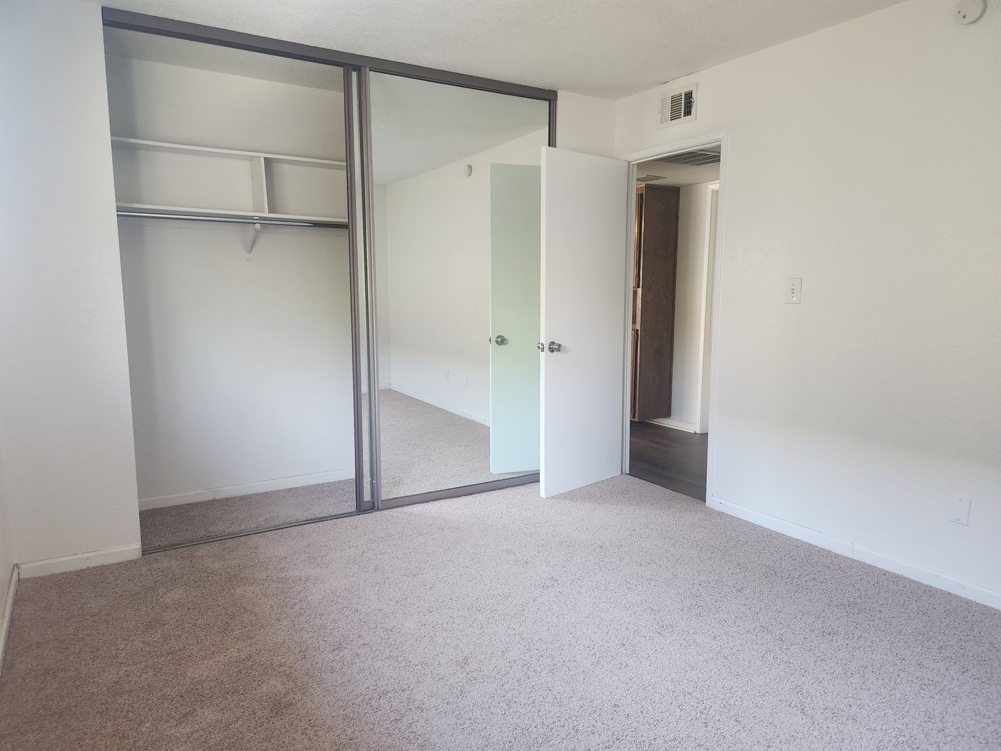 The 2 bedrooms have carpet and surround the bathroom