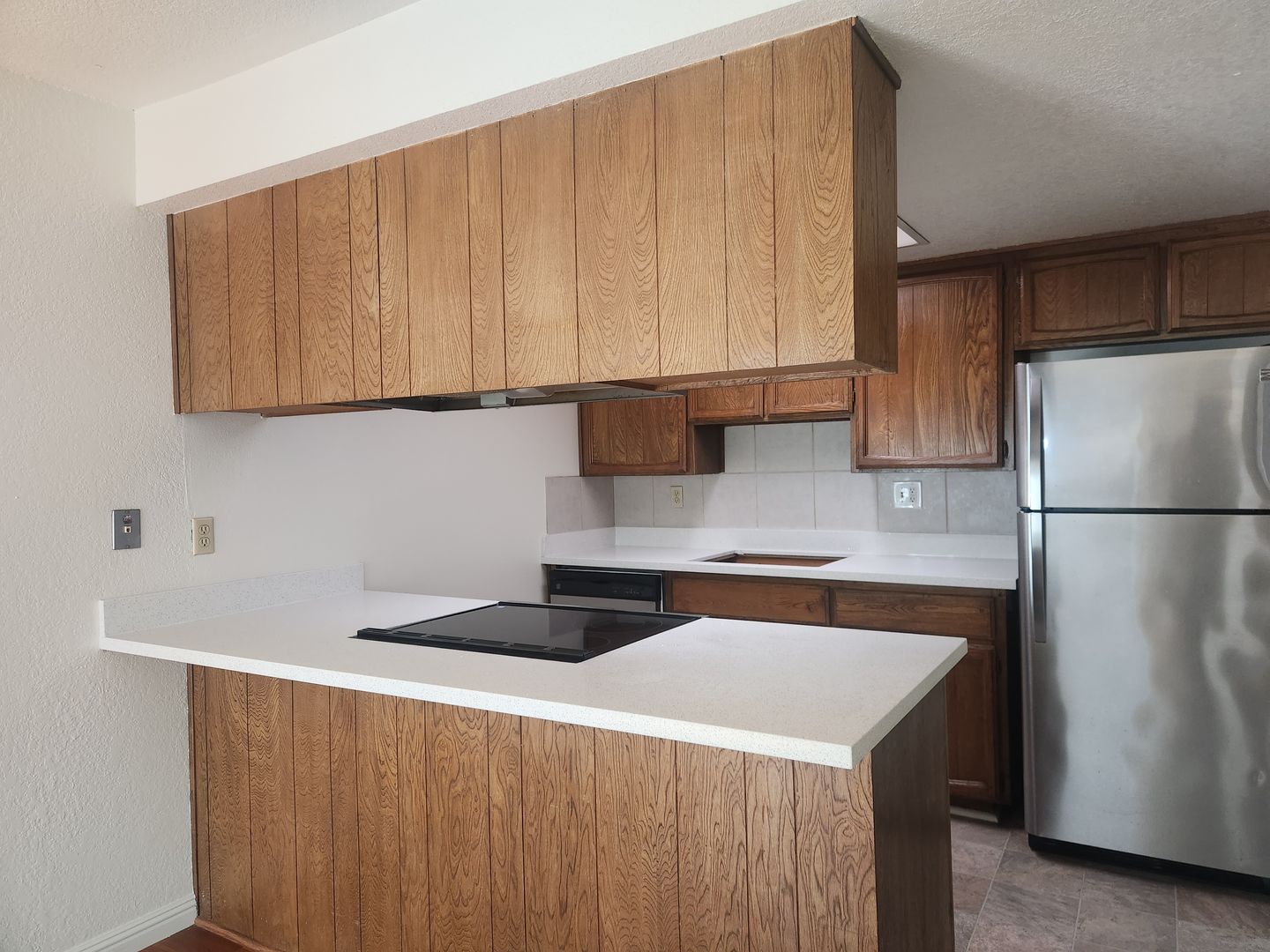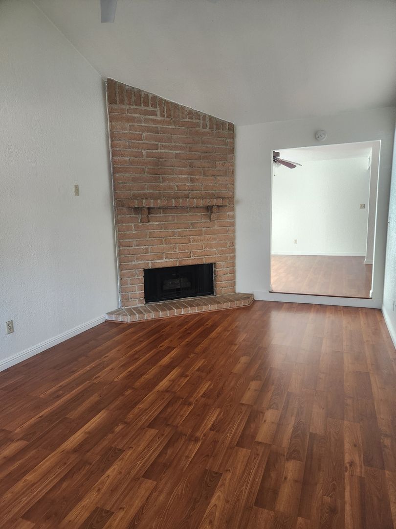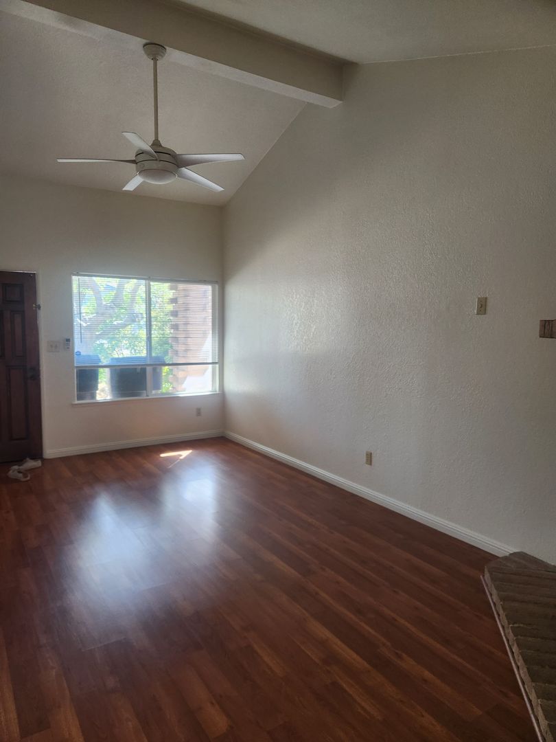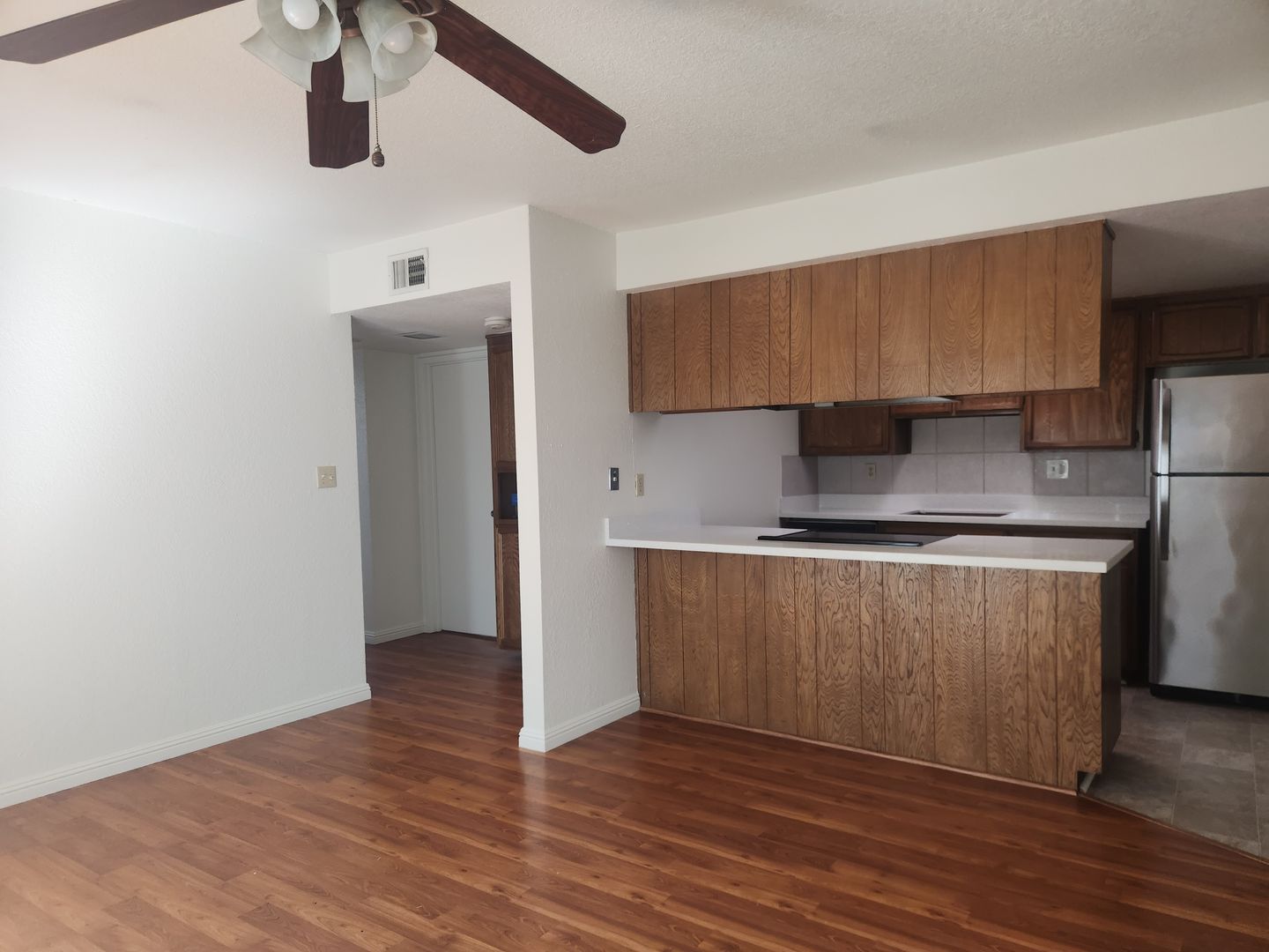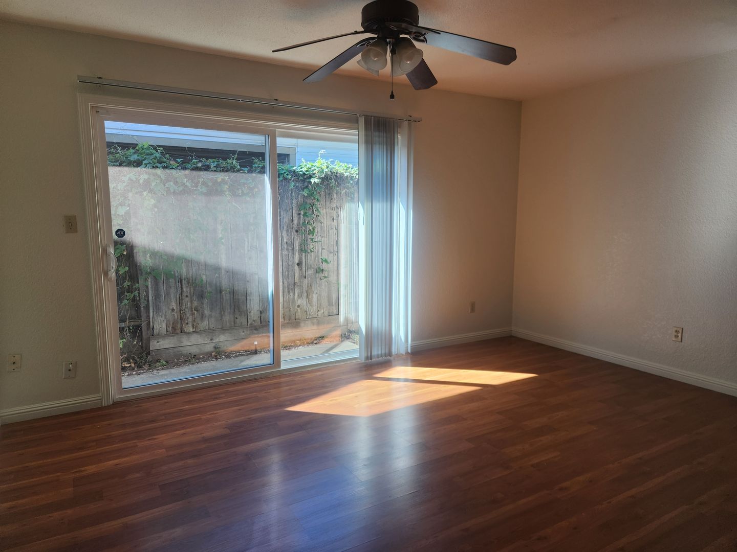 The living/Dining room has laminate flooring and plenty of space and has a slider which opens up to the backyard.