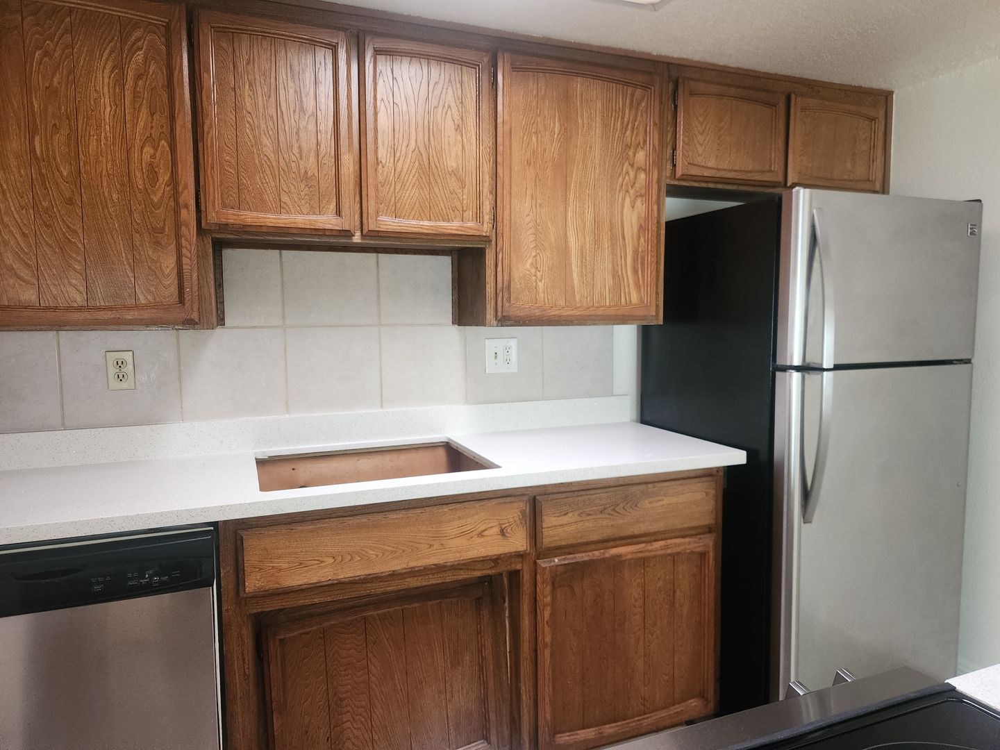 The kitchen has new lino flooring, new electric stove, plenty of cabinets, new quartz counters, Fridge and opens up to the dining room and living room