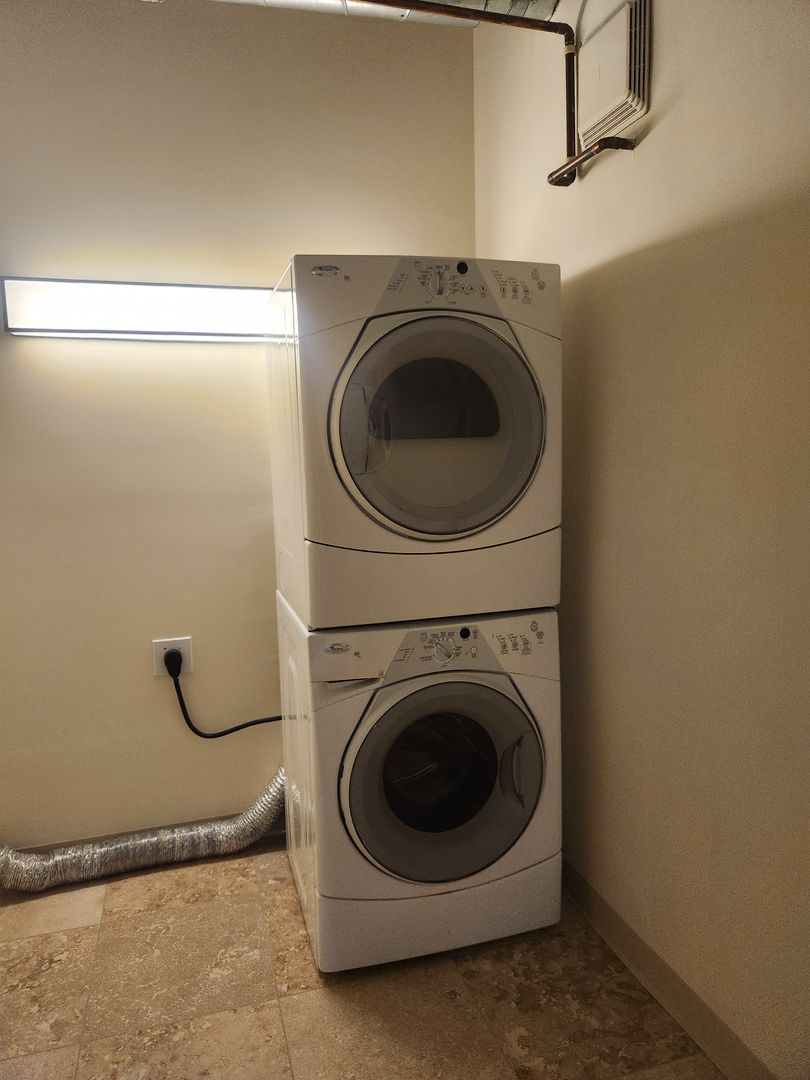 Off the hallway is the laundry room which holds the washer and dryer w no warranties and some room for storage