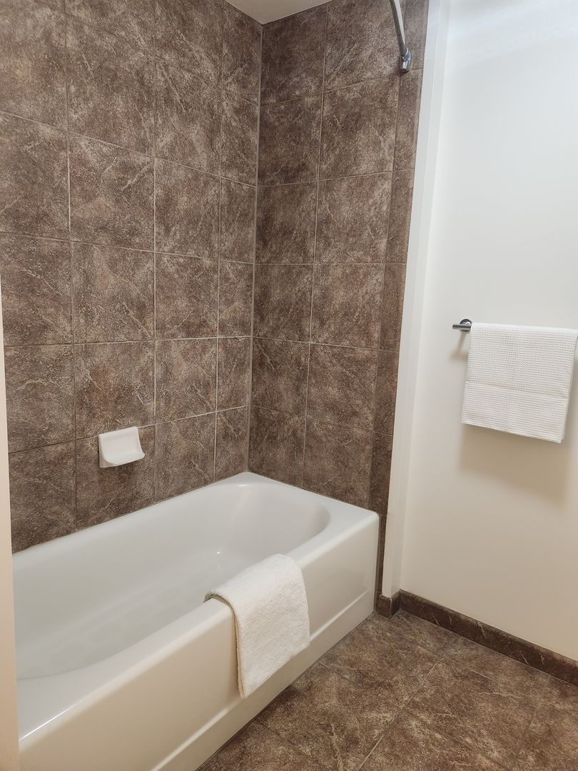 The bathroom has a tub w shower over, tile floors and is located next to the bedroom