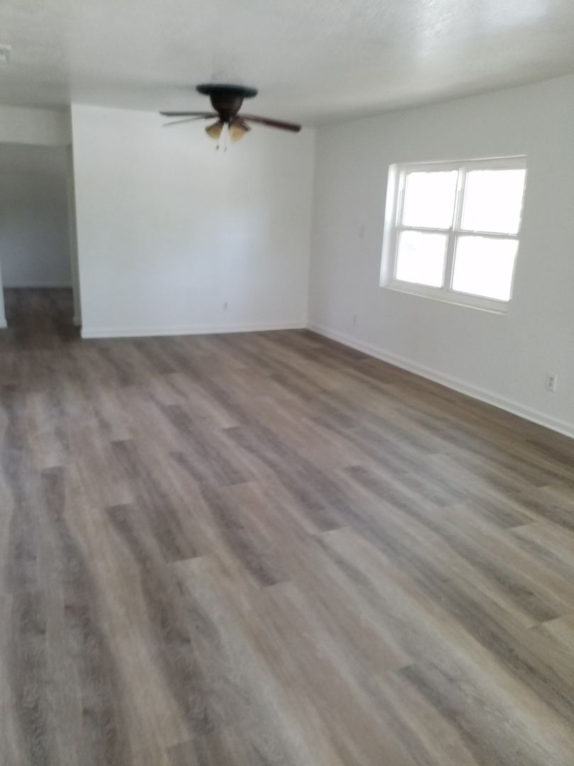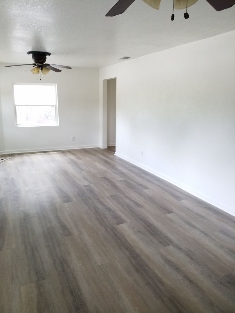 The living/Dining area is very large with LVP flooring and plenty of windows and ceiling fans to ease on those hot days