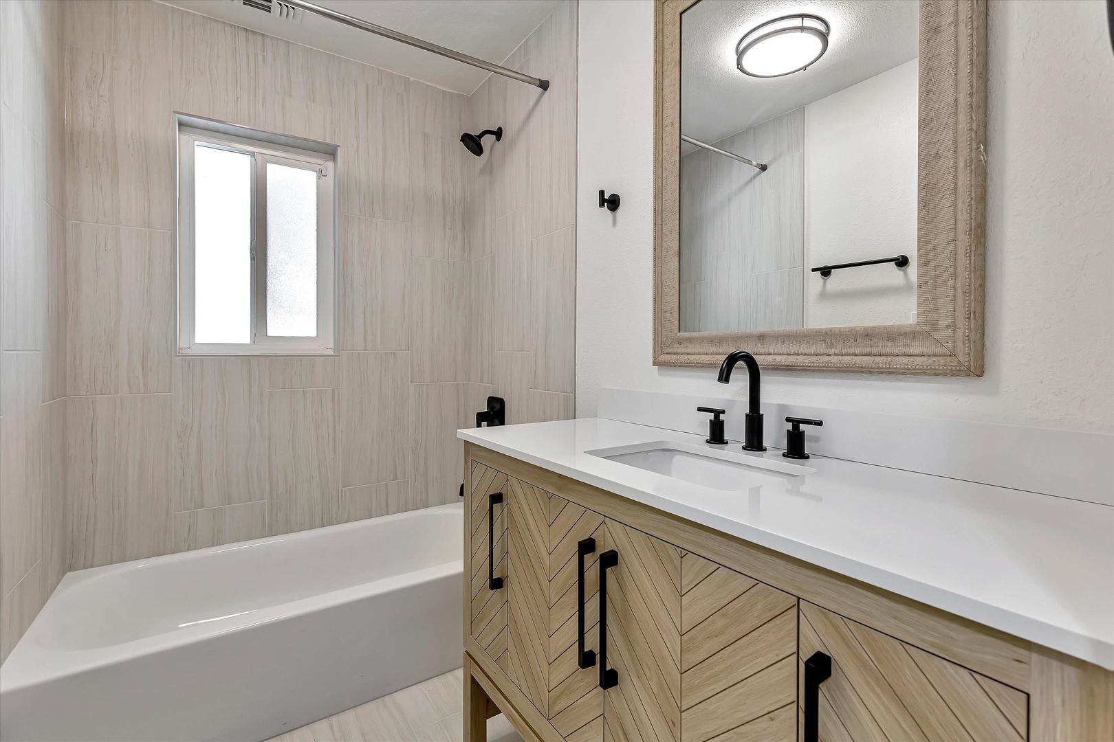 **Both bedrooms have wood plank floor for ease of cleaning. Modern vanity, tub with shower and updated finishes to include tile surround for tub area