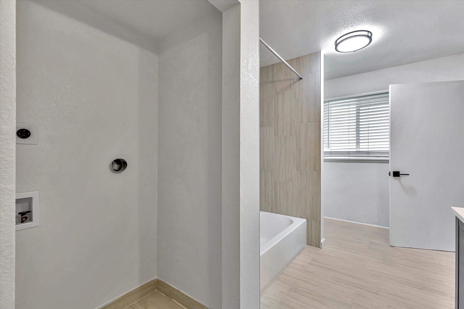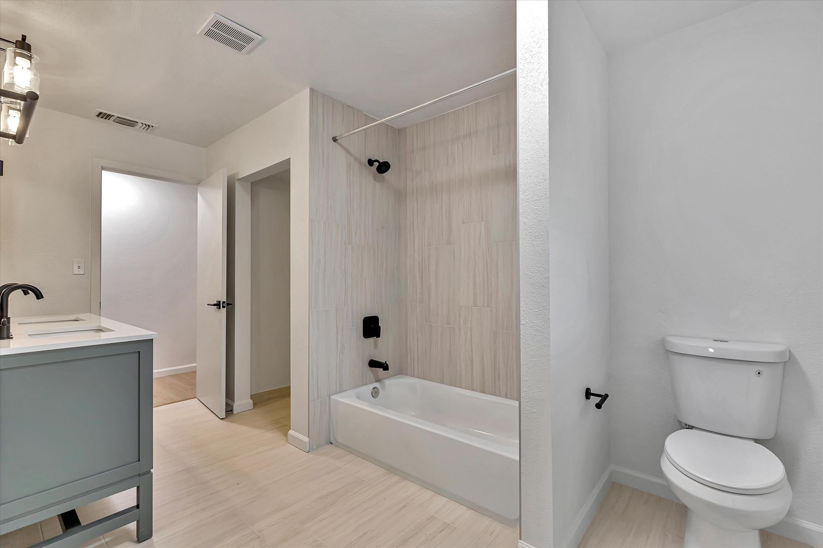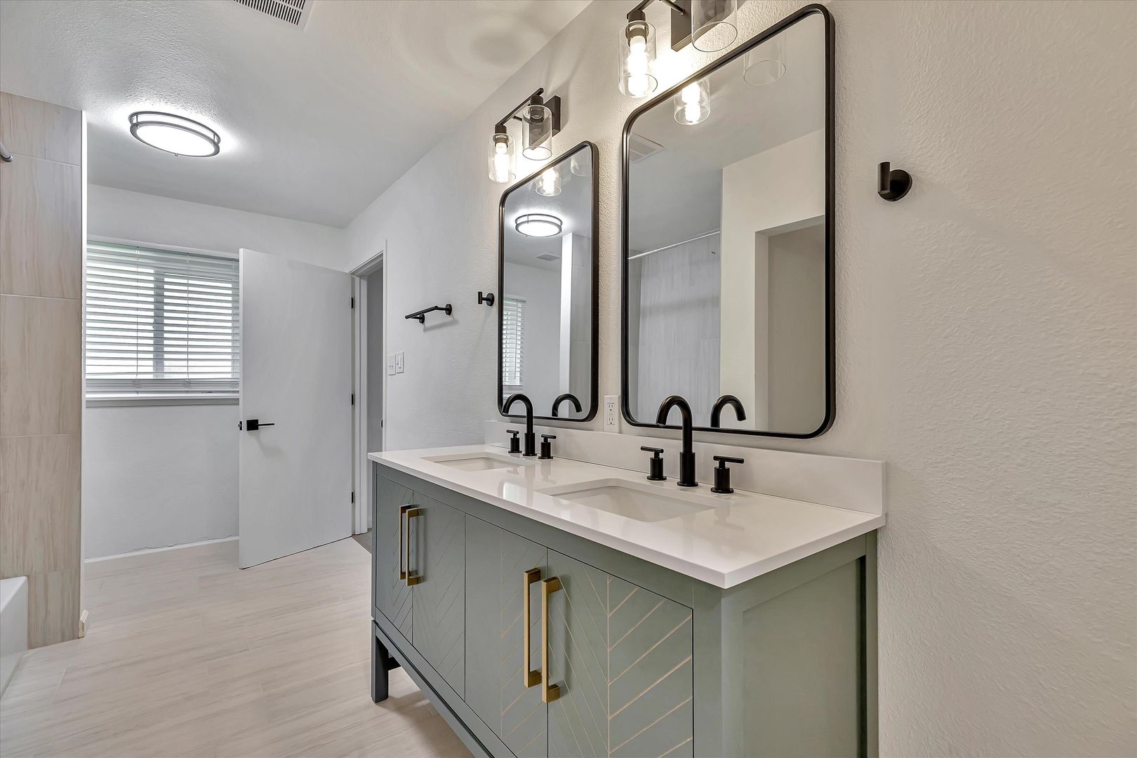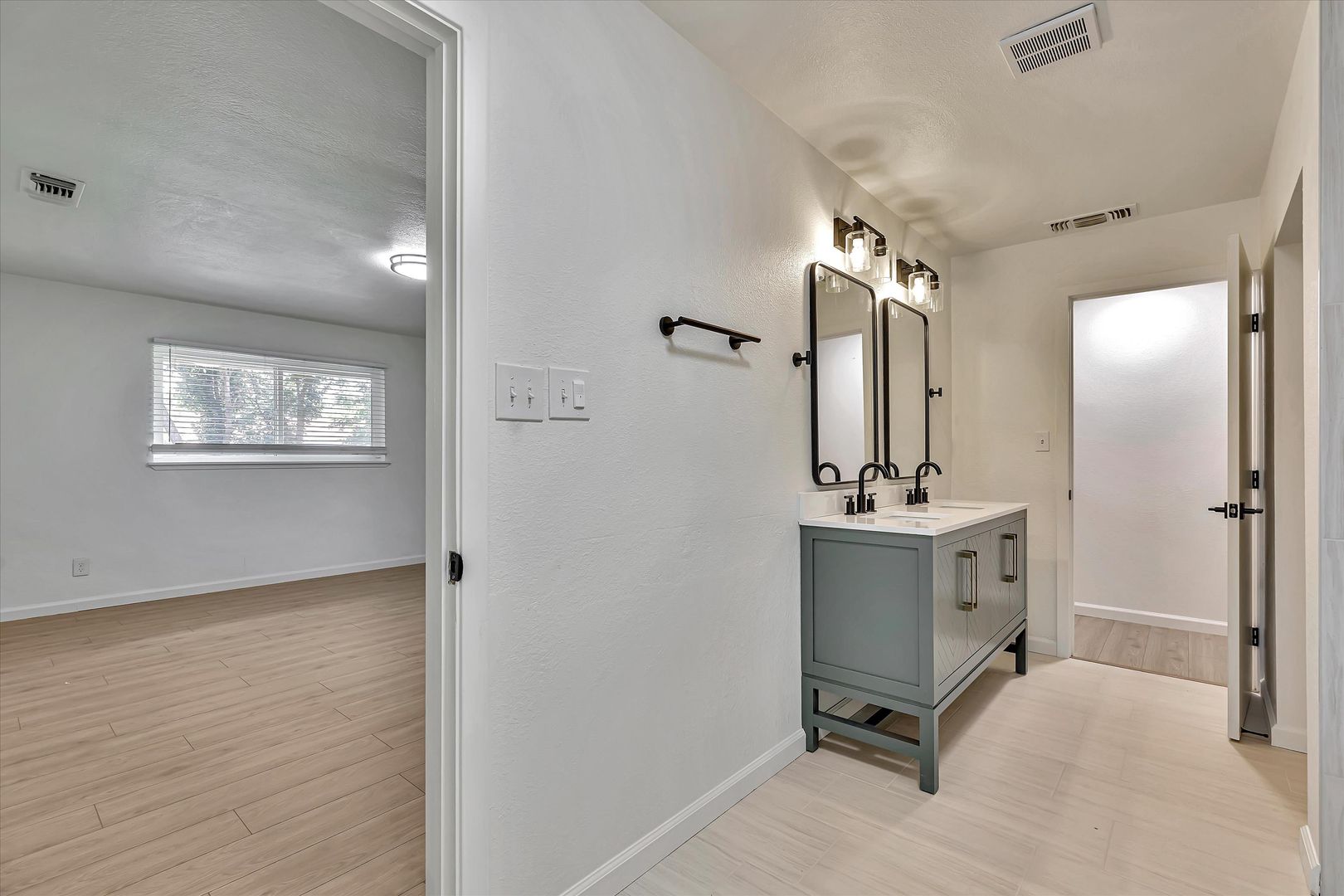 Both bedrooms have wood plank floor for ease of cleaning. Bathroom has double sinks, tub with shower and updated finishes to include tile surround for tub area