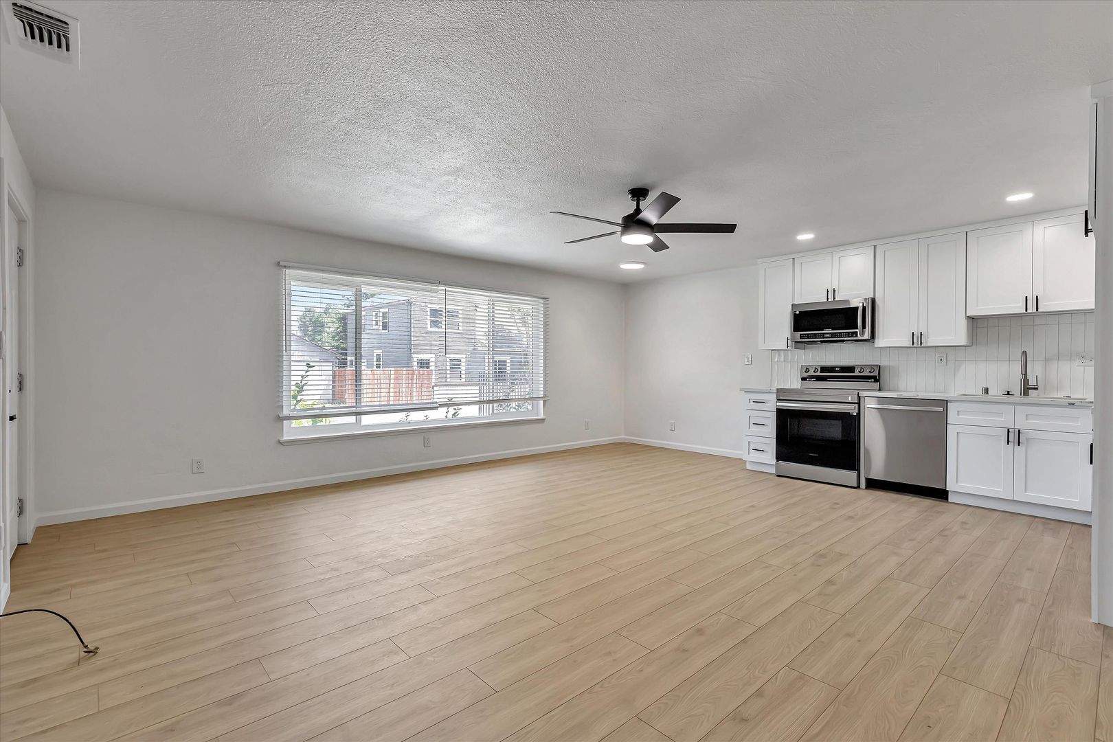 Step into this beautifully updated 2 bedroom, 1 bath unit featuring updated flooring throughout and modern finishes in every room. Enjoy an impressive kitchen with quartz countertops, gas stove, dishwasher, refrigerator, plenty of cabinets, and decorated w/ a tile backsplash. Unit also has central HVAC and parking