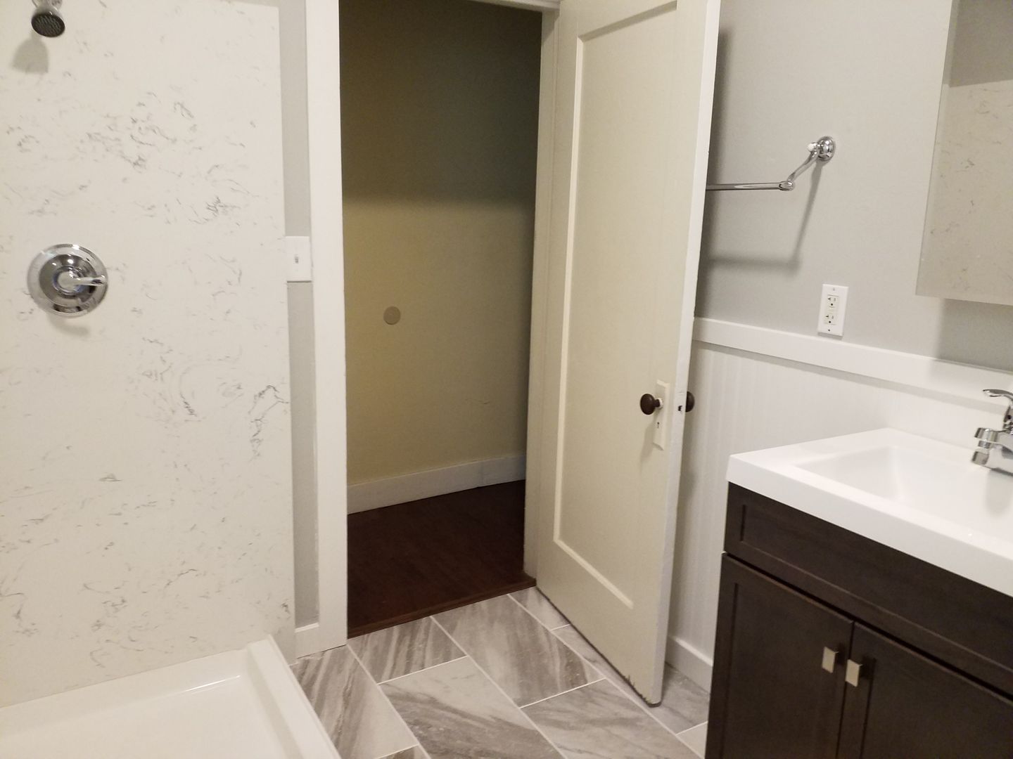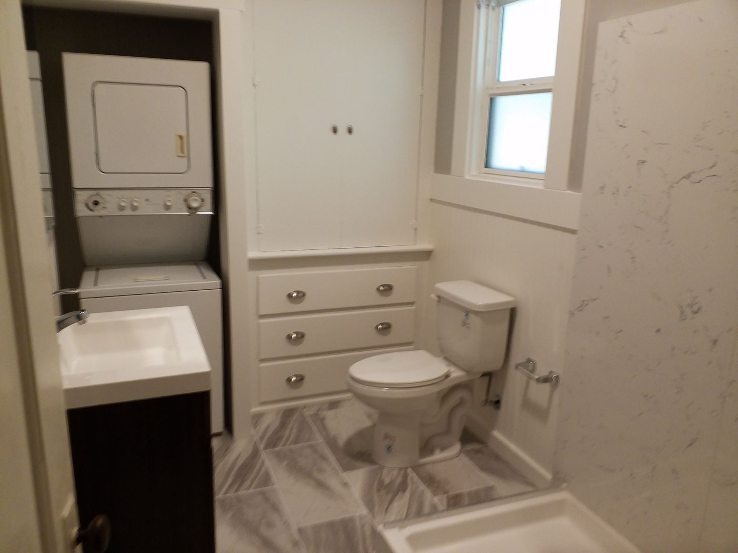 **The bathroom is completely remodeled with Shower only, cultured marble surround, w the washer dryer is located in the bathroom. The flooring in the bathroom is tile and large cabinet for storage