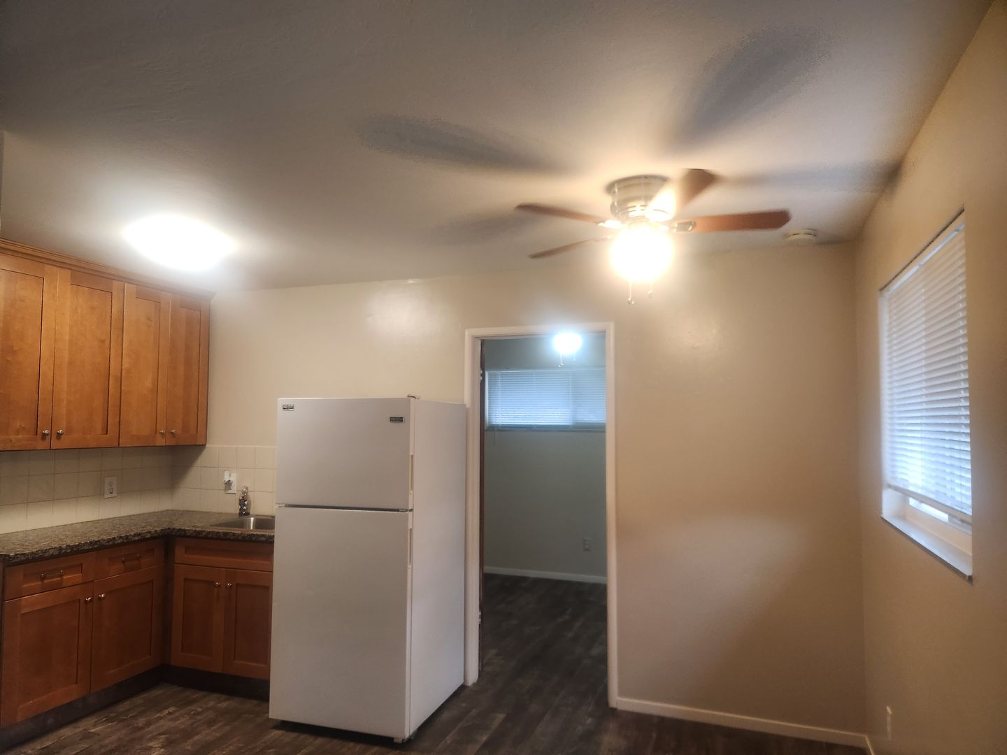 The kitchen has a gas stove, fridge, LVP flooring, Granite counters and wood cabinets