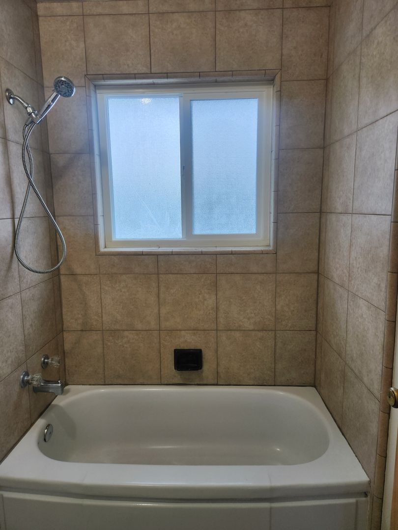The bathroom has a tub w shower over accented w a tile backsplash and tile flooring
