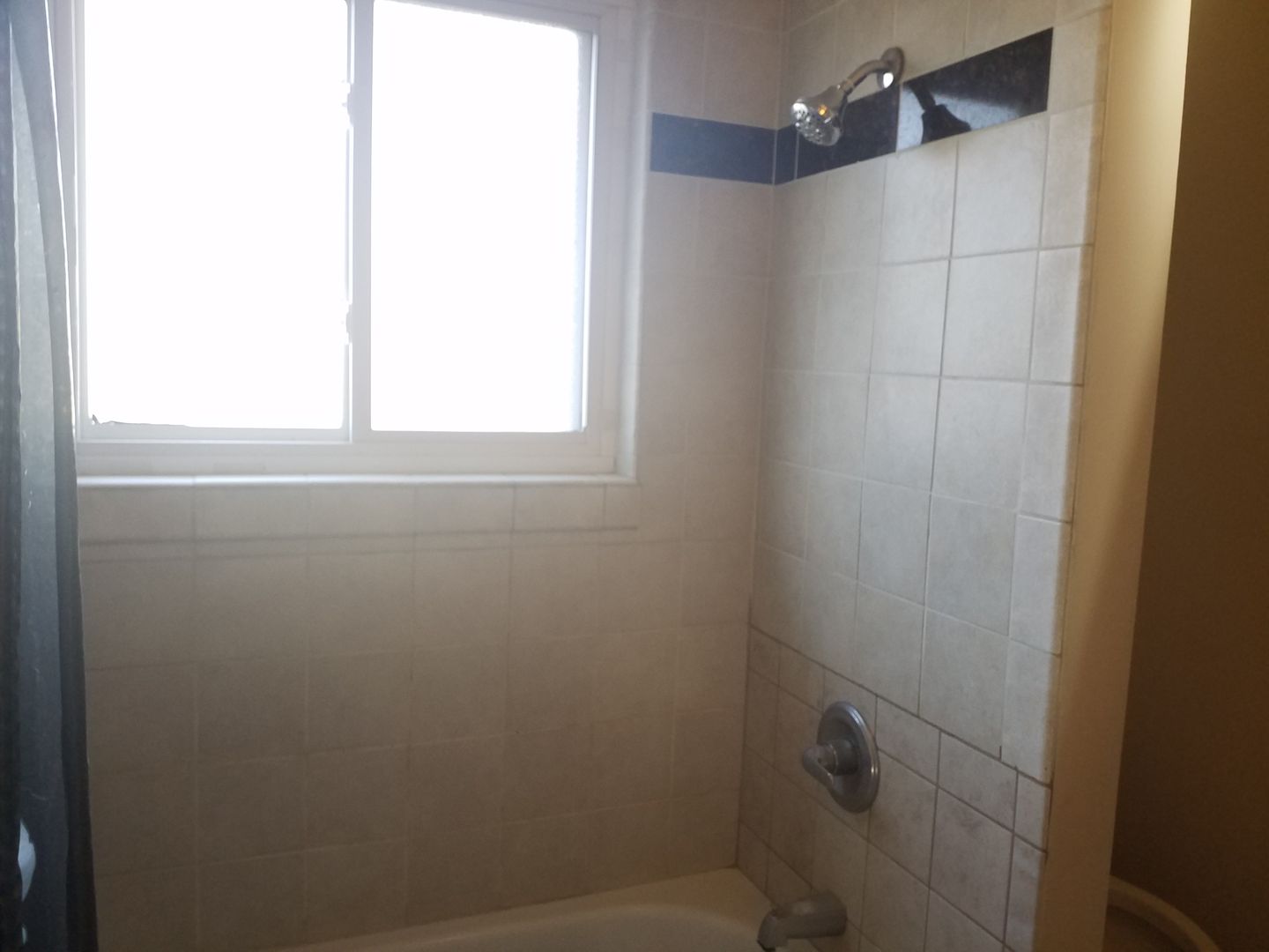 The bathroom has a tub with shower over and tile floors