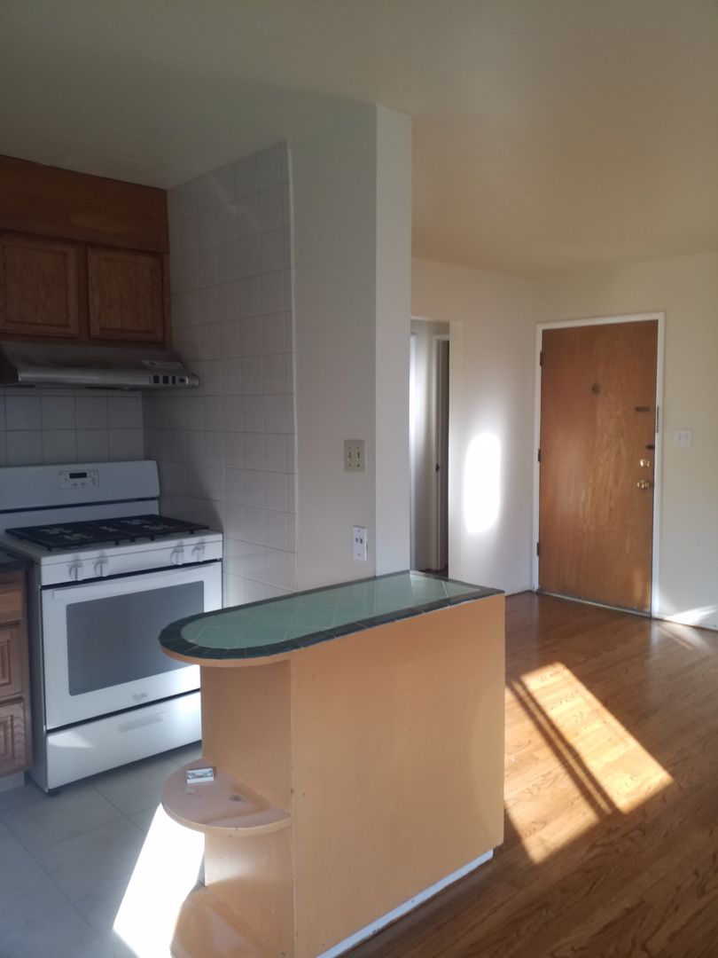 The kitchen has granite counters, comes with a fridge, gas stove, tile floors and plenty of cabinets including a small center island